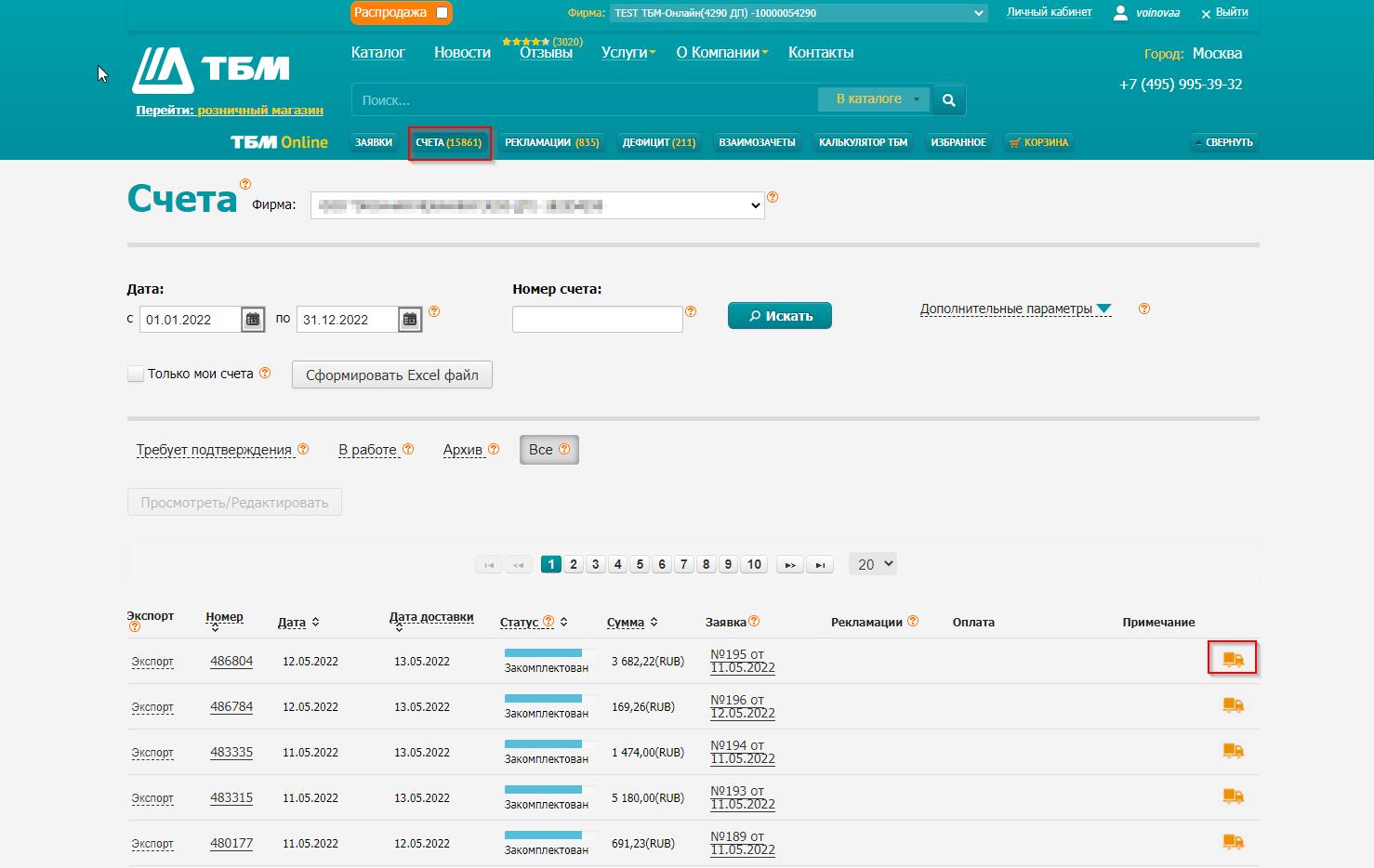В системе электронной торговли ТБМ-Онлайн добавлен сервис мониторинга доставки. Данный сервис позволяет в режиме реального времени отследить прибытие товара Клиенту и местоположение транспорта на карте. Для использования сервиса необходимо зайти во вкладку «счета», выбрать счет с доставкой на сегодняшнюю дату и нажать на изображение в виде «машины» .
