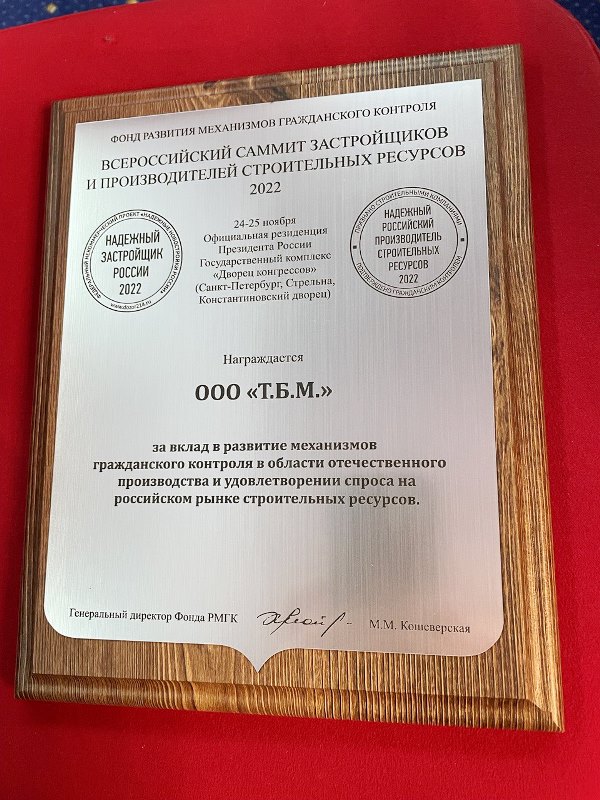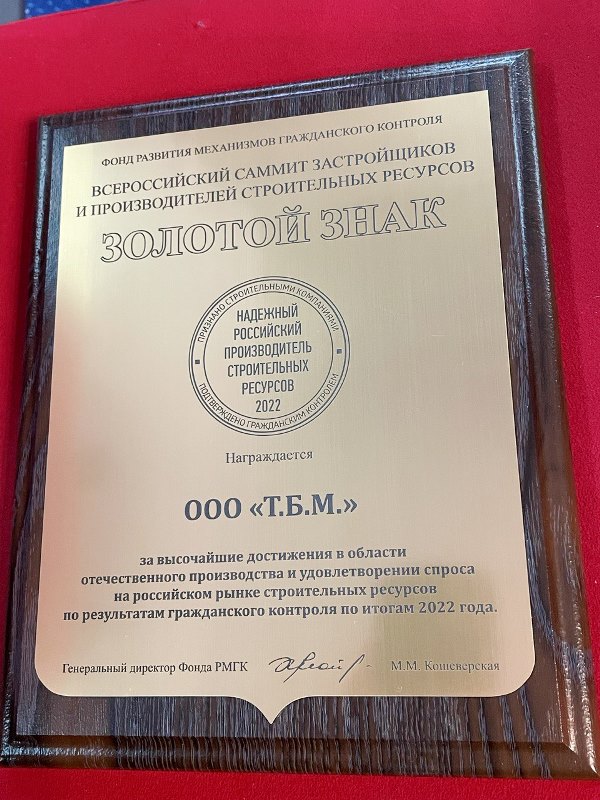 Компания ТБМ была награждена золотым знаком "Надежный российский производитель строительных ресурсов" в двух номинациях: «За достижения в области отечественного производства» и «За вклад в развитие механизмов гражданского контроля».