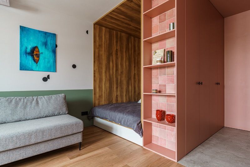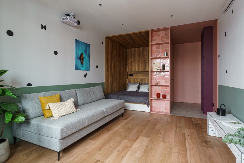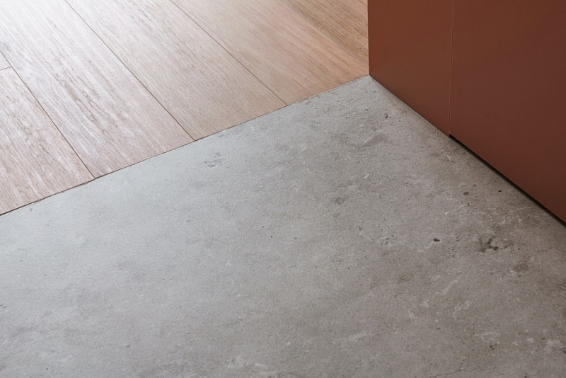 В качестве материала на пол были выбраны панели PVC. Текстуру дизайнер подобрал необычную - под бетон: брутальная пара нежному розовому. Внешне их не отличить от паркетной доски, даже замковое соединение похожее, но эта отделка в разы прочнее. Материал для укладки – паркетный клей Kleiberit 583.3. Простой в работе, он идеально подходит для укладки лакированного, мозаичного, массивного готового и штучного паркета, деревянных досок на все обычные грунтовые покрытия, такие как цементные стяжки, шпаклевки, керамические плитки и деревянные подложки. Клей хорошо держит гребенку и сохраняет свои свойства в открытой фазе в течение длительного периода времени.