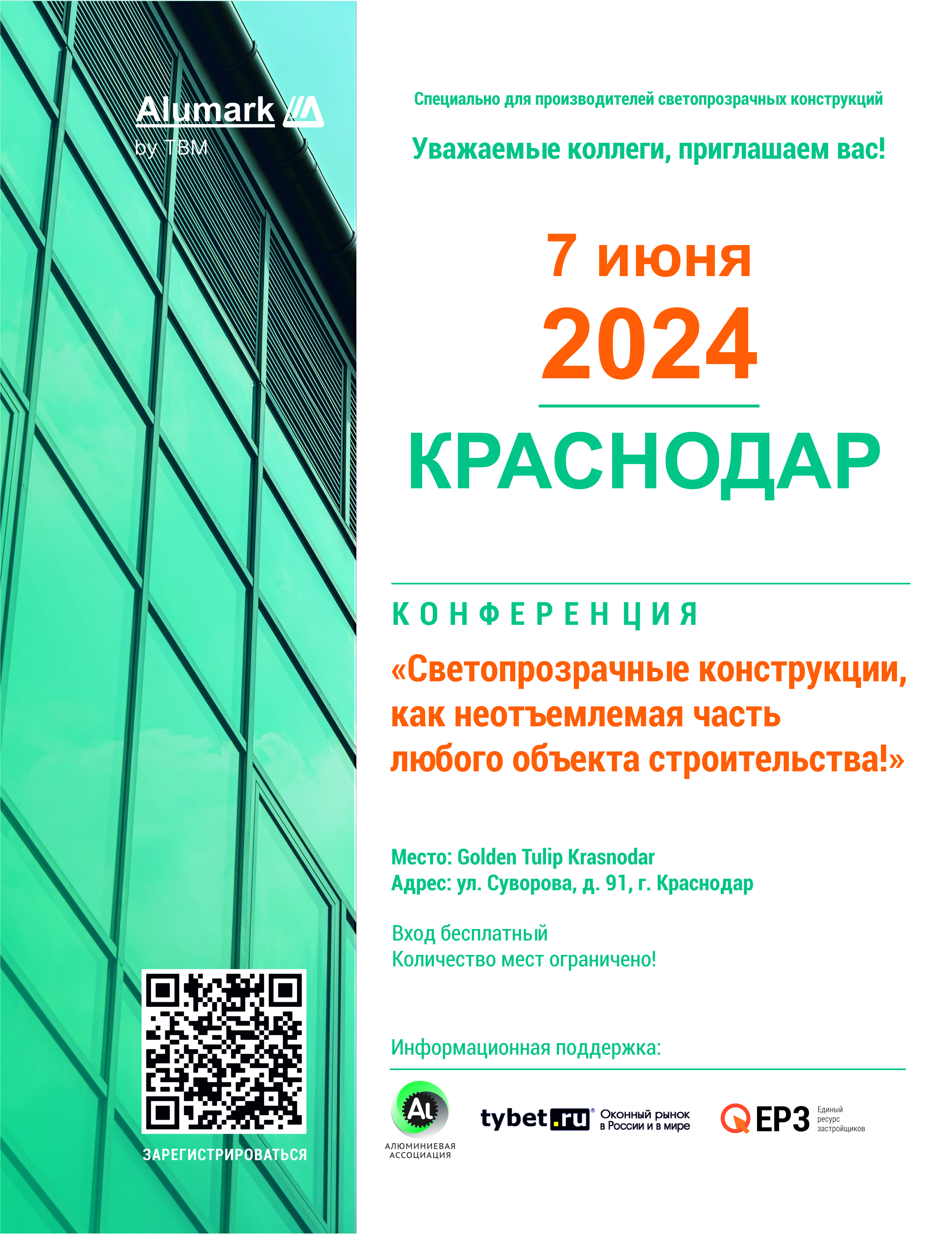 Компания ТБМ приглашает производителей светопрозрачных конструкций принять участие в конференции под названием "Светопрозрачные конструкции как неотъемлемая часть любого объекта строительства", которая состоится в Краснодаре 7 июня 2024 г.