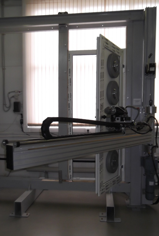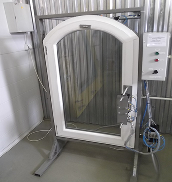 Стенд позволяет проводить испытания оконной фурнитуры на продолжительность функционирования для поворотно-откидных оконных блоков 20000 +1% циклов открывания-закрывания-откидывания.
