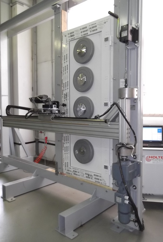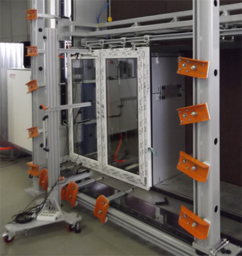 На стенде можно проводить тестирование оконных и дверных блоков размером до 3х3 метра, в том числе и элементов фасадных конструкций и ворот. Уникальность стенда заключается в том, что на нем можно проводить испытания светопрозрачных конструкций в любых погодных условиях и при диапазоне регулирования температуры от -30С до +60С.